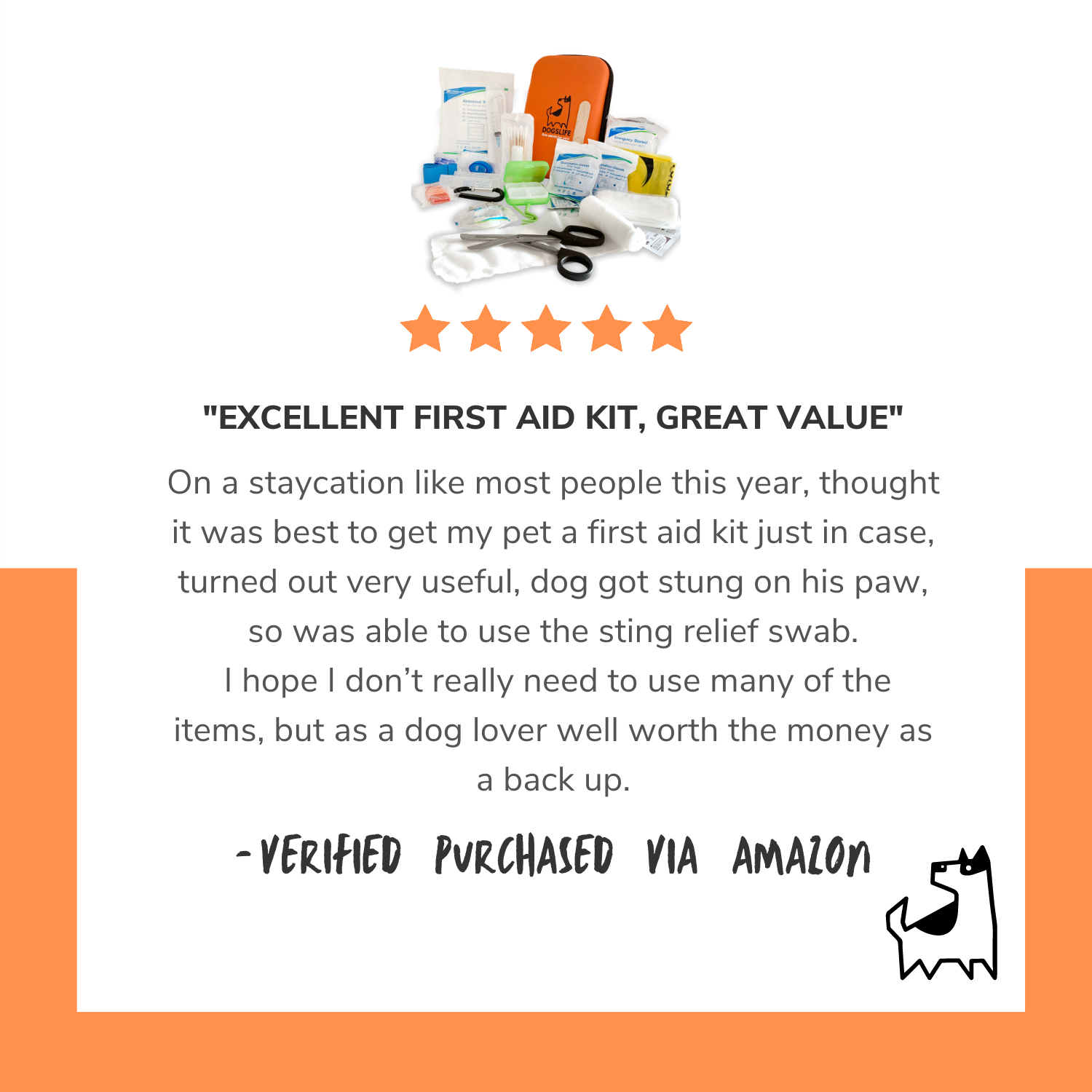 With over 30 pieces of professionally tested dog first aid supplies included, you’re well set to take on anything from cuts and stings to shocks and choking.